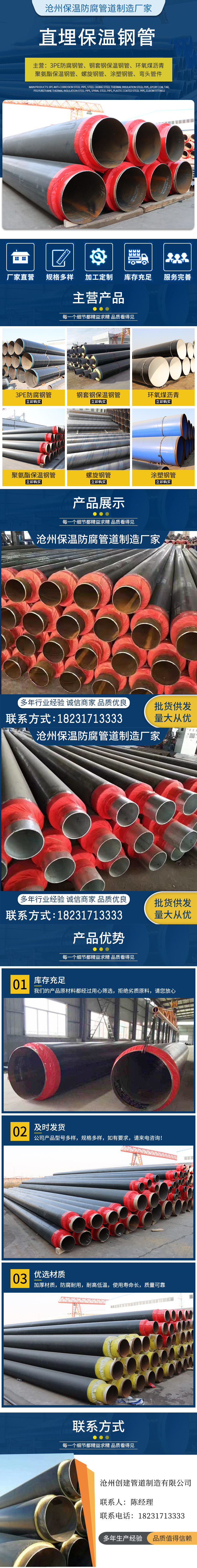 主营产品:生产螺旋钢管、直缝钢管、保温钢管及管件(直埋保温管、钢套钢保温管、玻璃钢保温钢管、缠绕保温钢管)、防腐钢管及管件、凃…